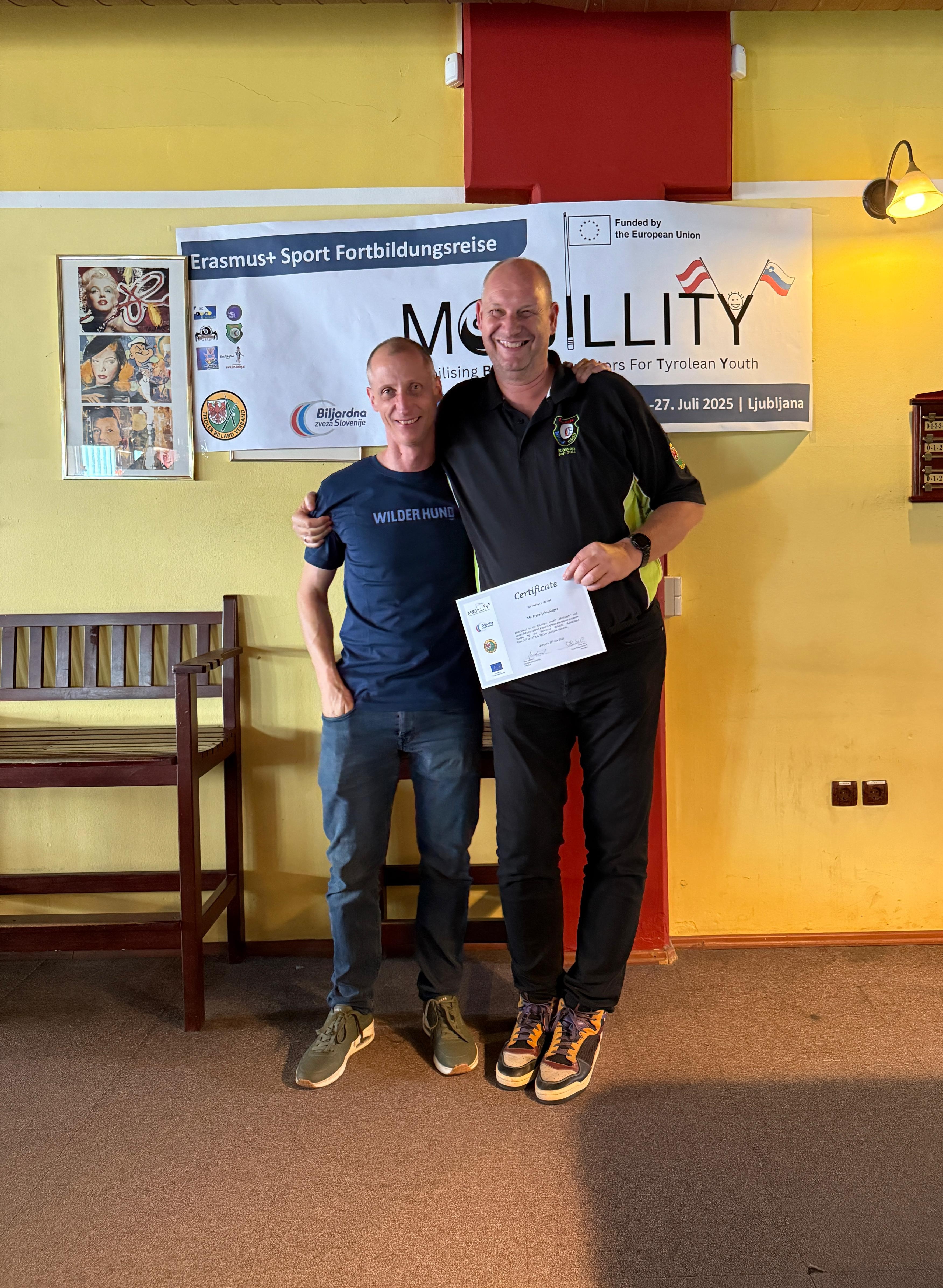Mit in dieser Delegation war Frank Eckschlager vom LBC-Kössen. Das Projekt "MOBILLITY" wird in Kooperation mit dem Billard Verband Slowenien durchgeführt. Die Fortbildung leitete dabei niemand geringerer als Mitja Gradisnik, der als slowenischer Jugendnationaltrainer sowie Betreiber einer „Pool School“ aktuell mehrere international erfolgreiche Athlet:innen betreut und auch selbst als Trainer international tätig ist. Bei der heurigen Jugend-EM brachte Mitja 15 Medaillenträger:innen - darunter 5 Europameister - hervor.